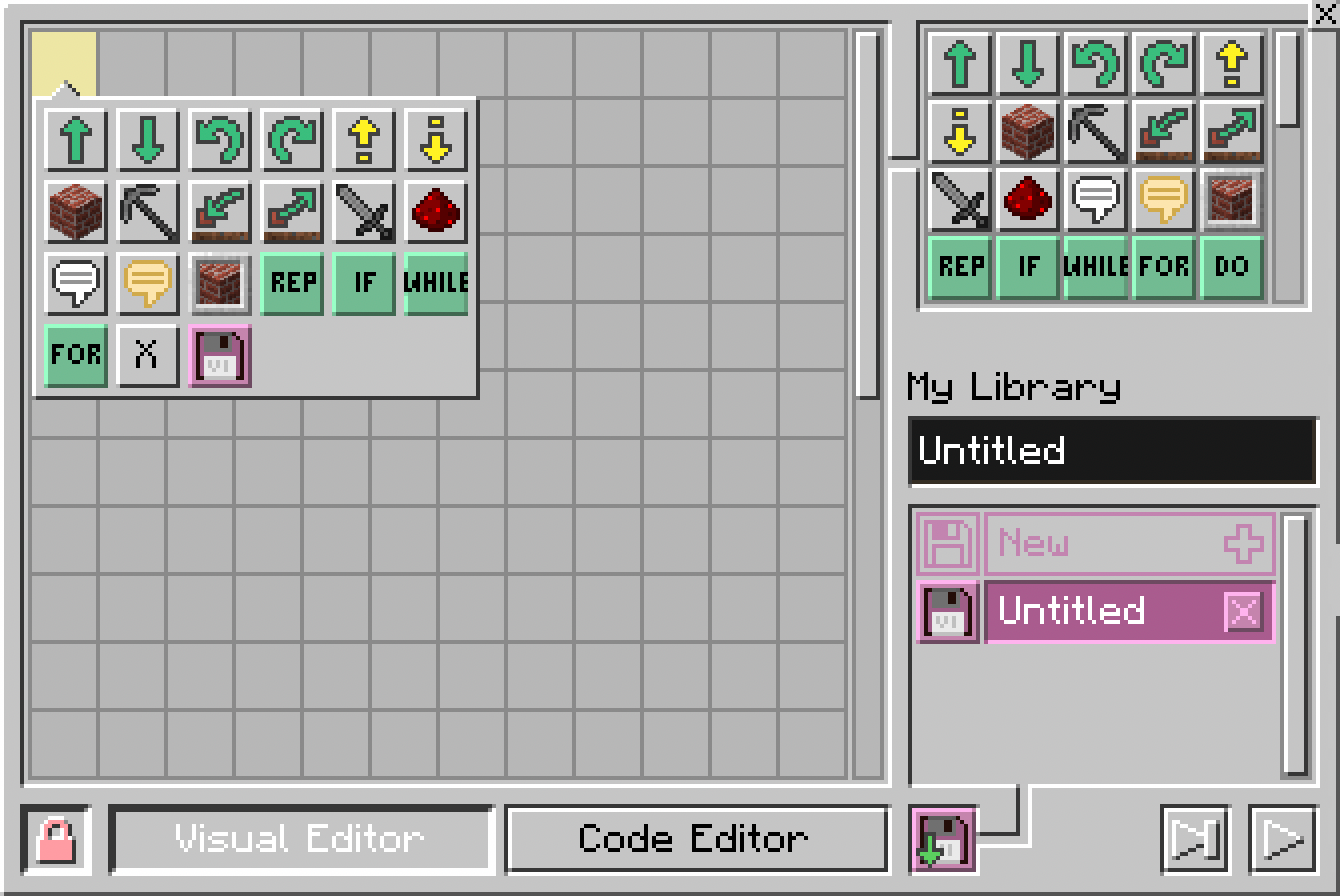 - Edytor – w którym programujemy, czyli wstawiamy odpowiednie komendy, klikając żółte lub czerwone kwadraciki i wybierając odpowiednie polecenia z panelu, który się wtedy pojawi.