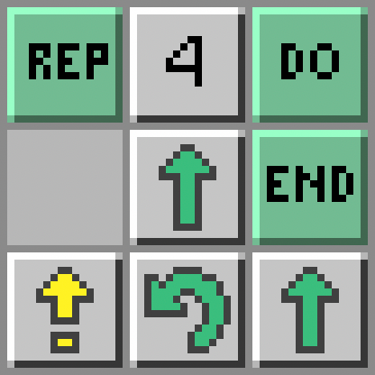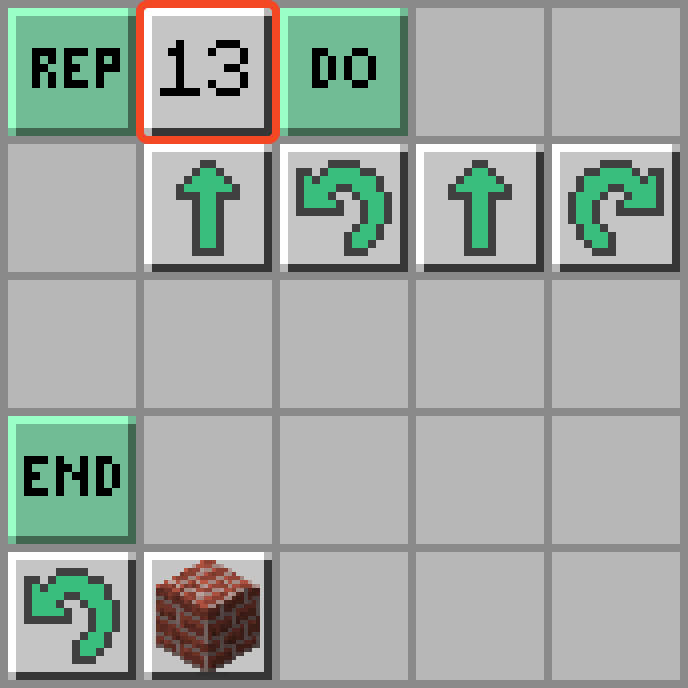 - Żółwik jest oddalony od mechanizmu o 4 bloki, skorzystamy więc z odpowiedniej pętli, aby nie wpisywać kilka razy tych samych poleceń. Żółwik powtórzy polecenia 4 razy: Repeat - Number (4) - Do