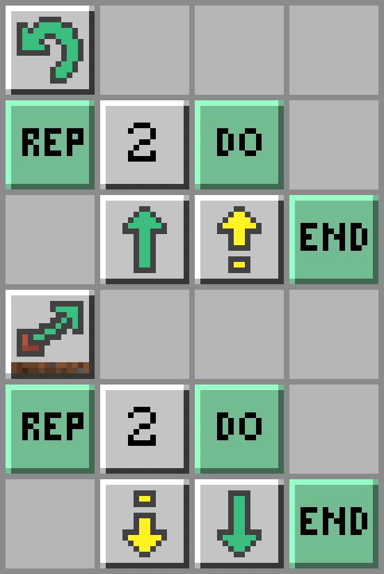 - Miejsce, gdzie żółwik postawi blok zasilający również jest oddalone od żółwika o 2 bloki. Żółwik powtórzy polecenia 2 razy: Repeat - Number (2) - Do