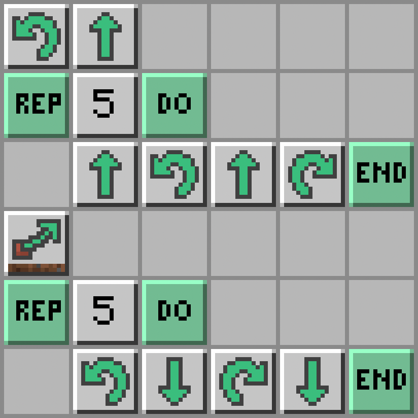 - Żółwik jest oddalony od skrzynki o 5 bloków, skorzystamy więc z odpowiedniej pętli, aby nie wpisywać kilka razy tych samych poleceń. Żółwik powtórzy polecenia 5 razy: Repeat - Number (5) - Do