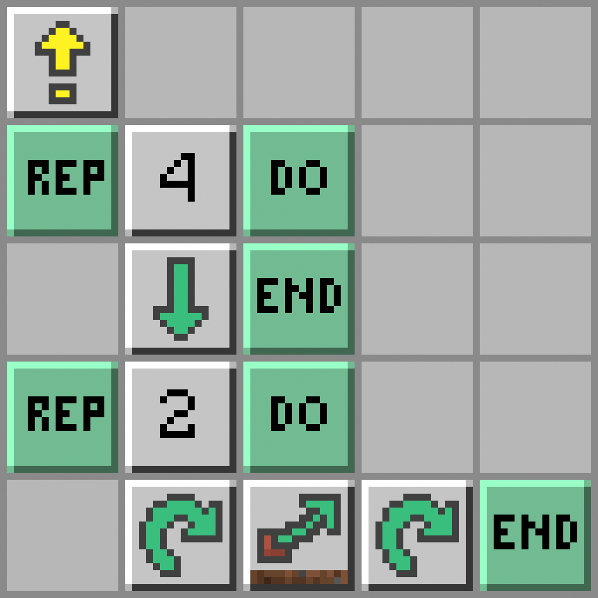 - Żółwik obróci się w prawo: Turn Right; wyjmie przedmioty ze skrzynki, która jest przed nim: Take Items; i znów obróci się w prawo: Turn Right
