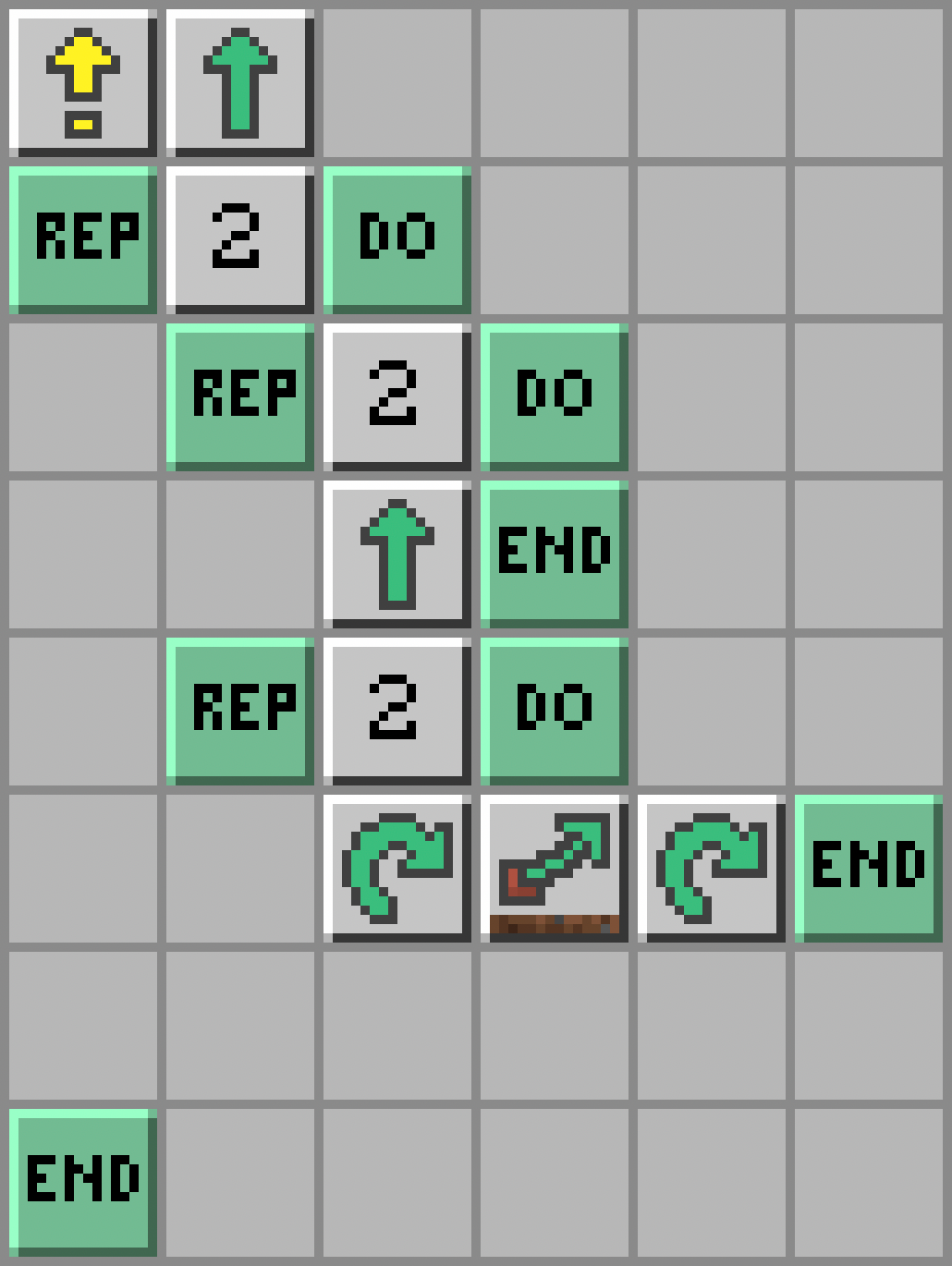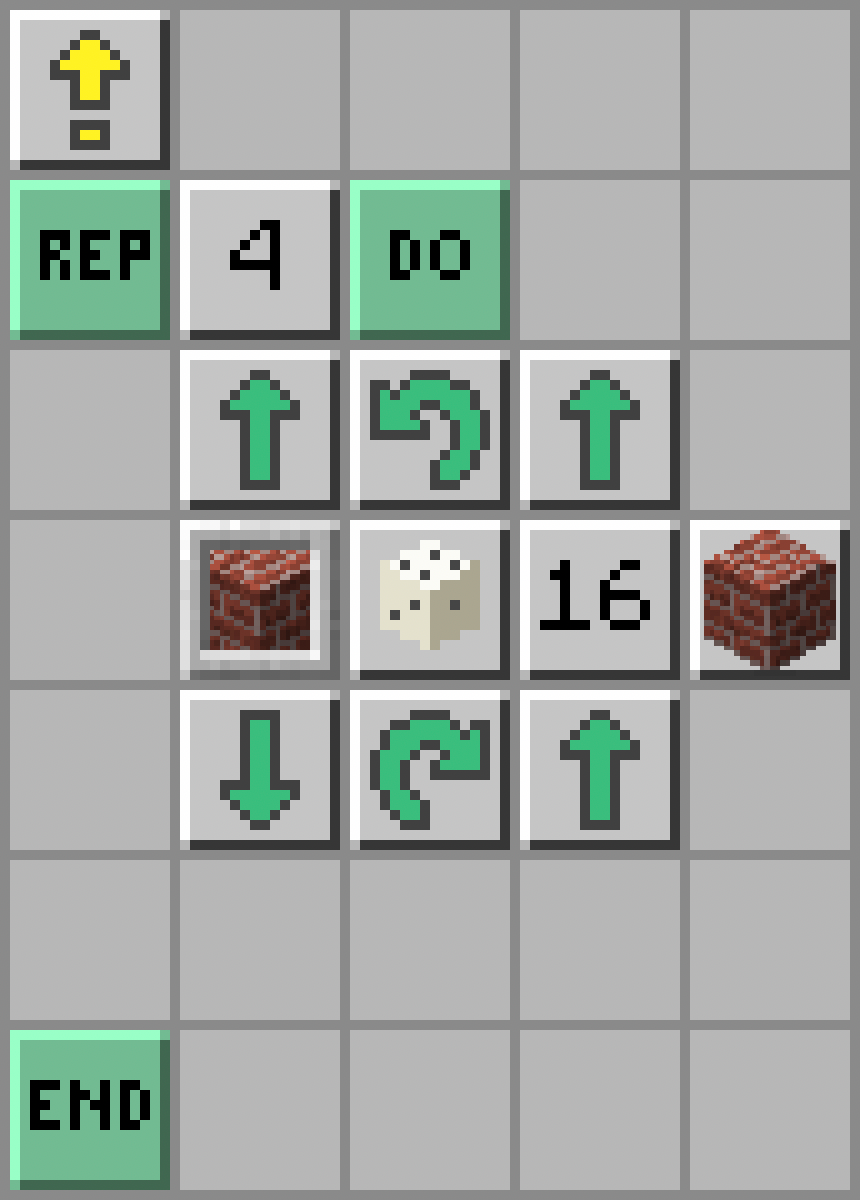 - Są 2 rzędy po 2 skrzynki, skorzystamy więc z odpowiedniej pętli, aby nie wpisywać kilka razy tych samych poleceń. Żółwik powtórzy polecenia 2 razy: Repeat - Number (2) - Do