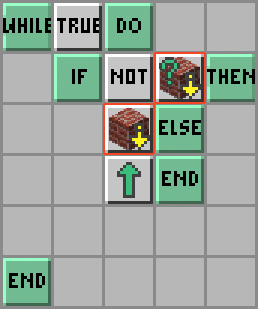 - Żółwik obróci się w prawo: Turn Right; wyjmie przedmioty ze skrzynki, która jest przed nim: Take Items; i znów obróci się w prawo: Turn Right