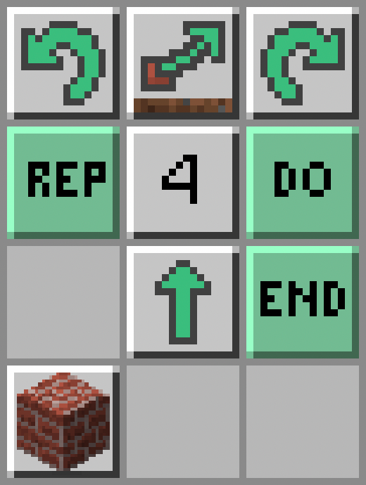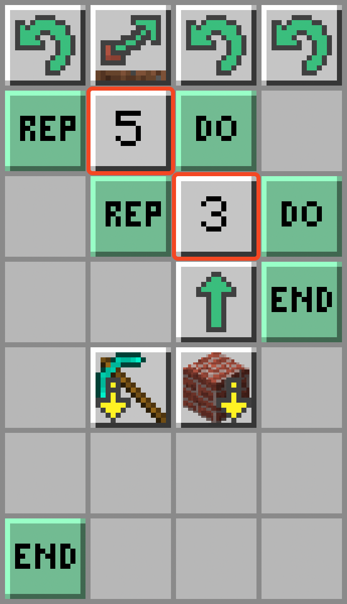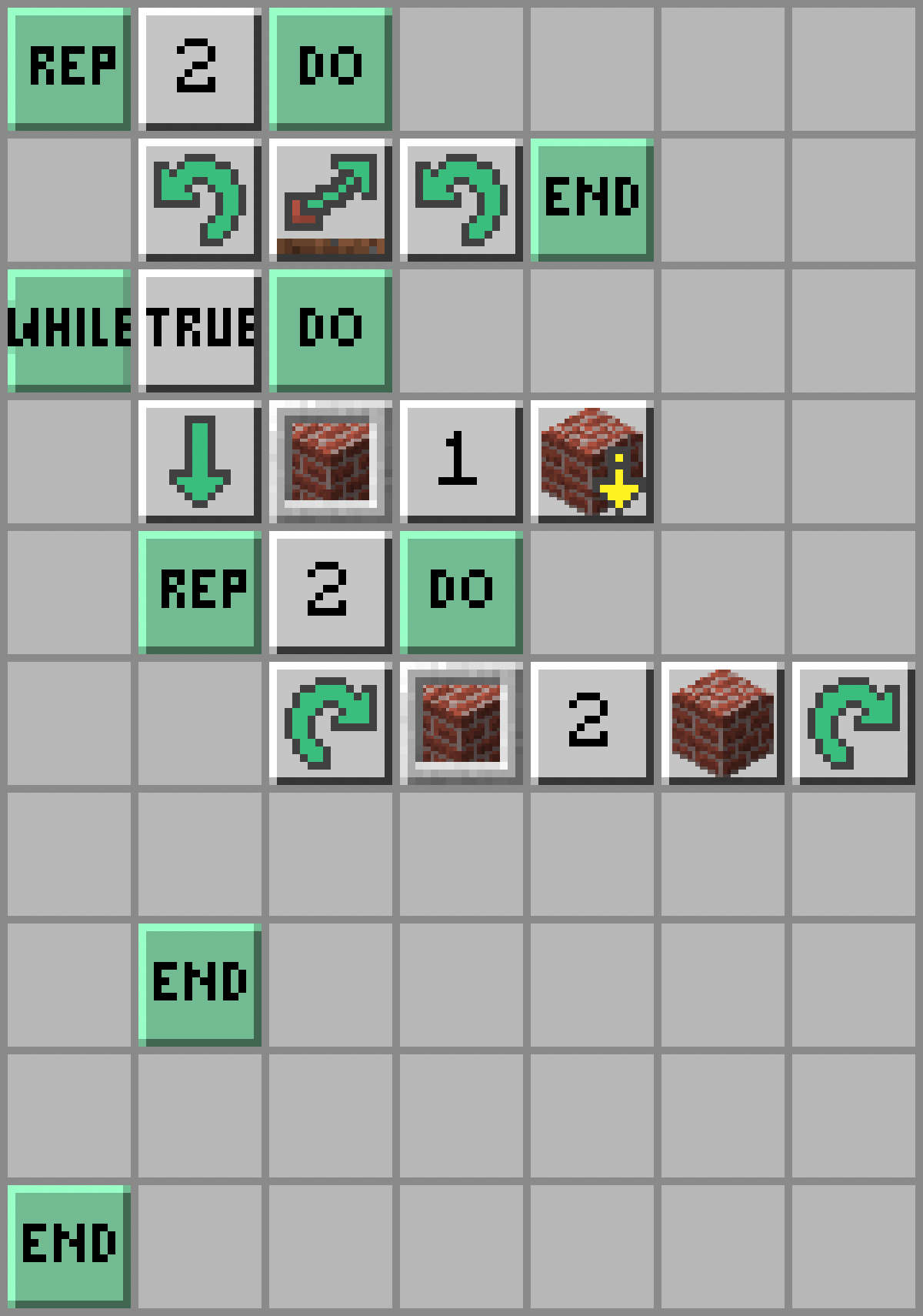 - Żółwik obróci się w prawo: Turn Right; wybierze bloki ze swojego ekwipunku ze slotu 2: Select Slot - Number (2); postawi blok przed sobą: Place; i znów obróci się w prawo: Turn Right