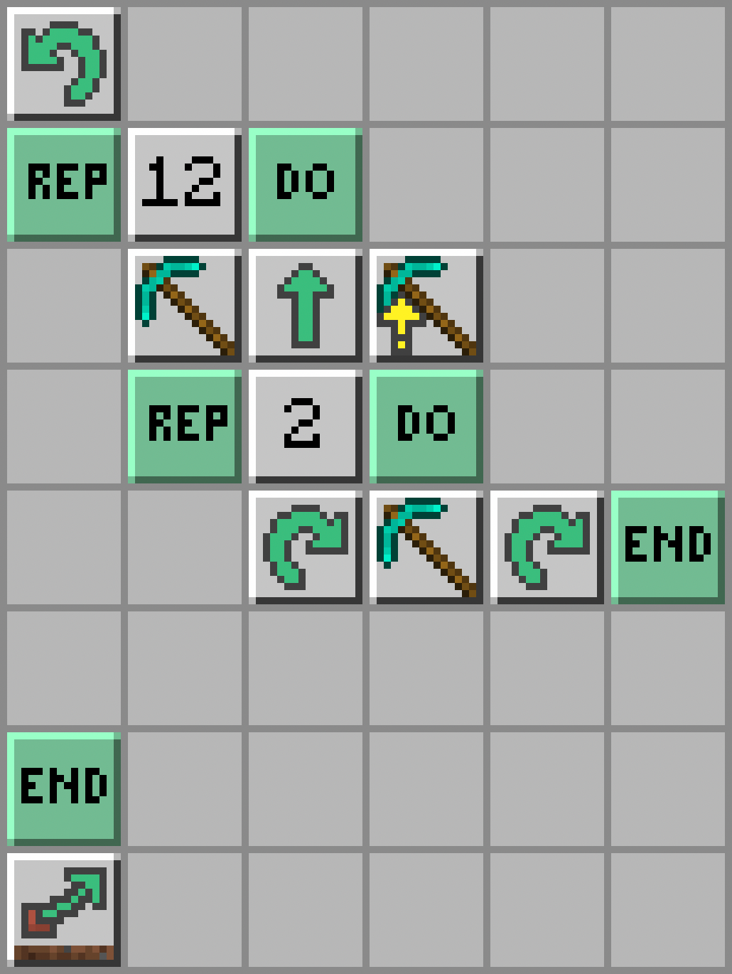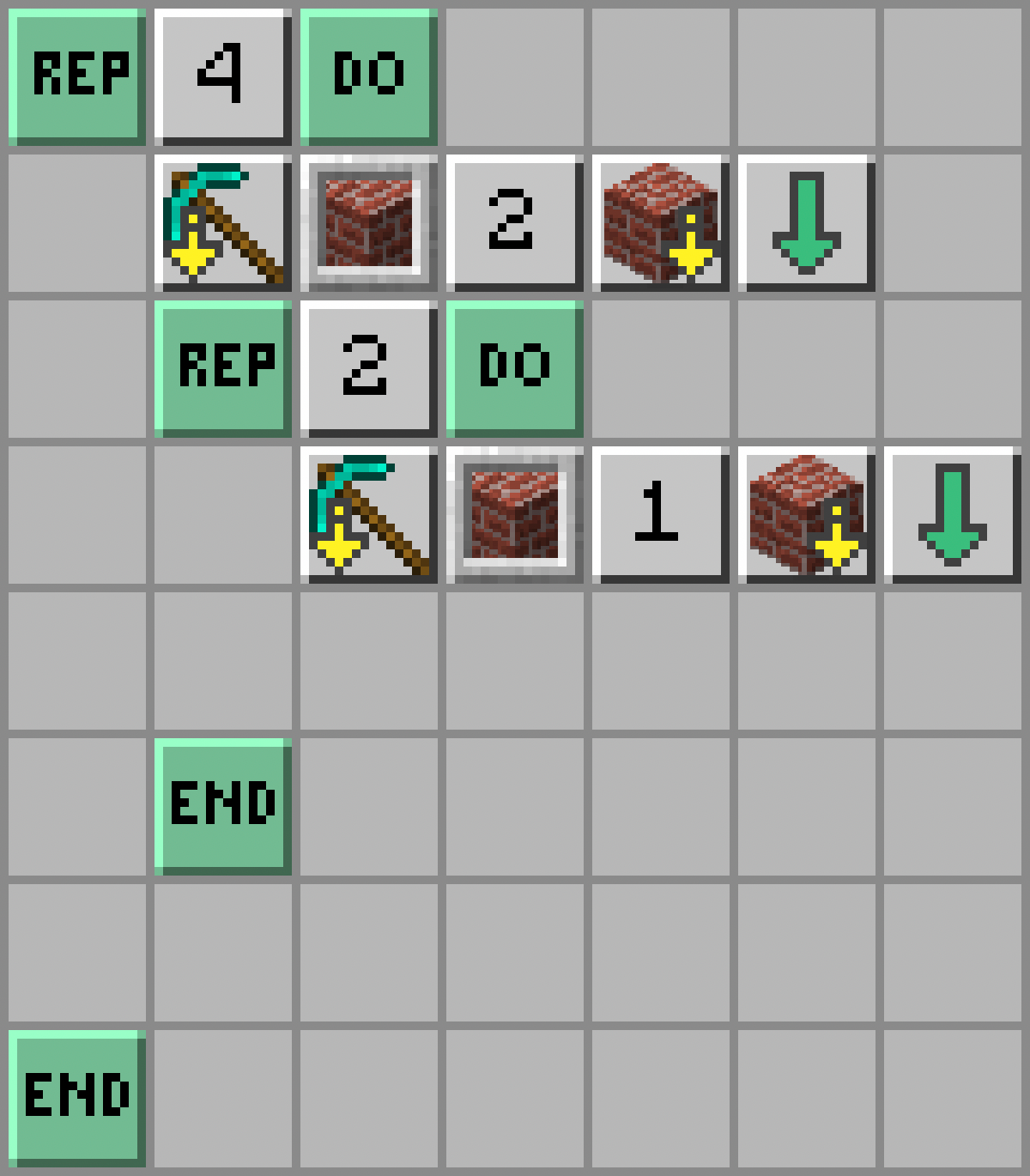 - Żółwik wykopie blok pod sobą: Dig Down; wybierze bloki ze swojego ekwipunku ze slotu 1: Select Slot - Number (1); postawi blok pod sobą: Place Down; i ruszy się do tyłu: Move Back