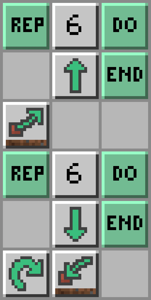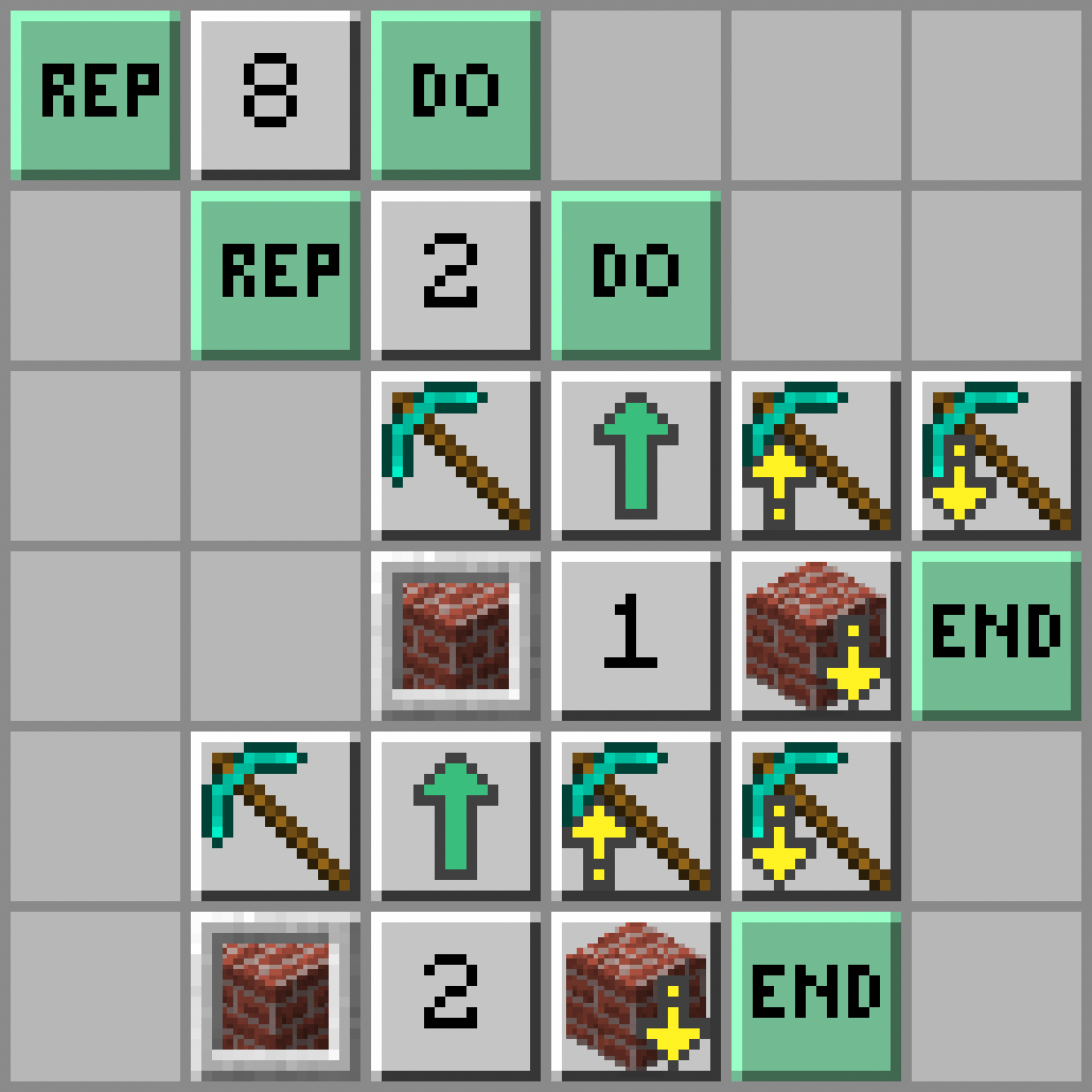 - Żółwik wykopie blok przed sobą: Dig; ruszy się do przodu: Move Forward; wykopie blok nad sobą: Dig Up; wykopie blok pod sobą: Dig Down