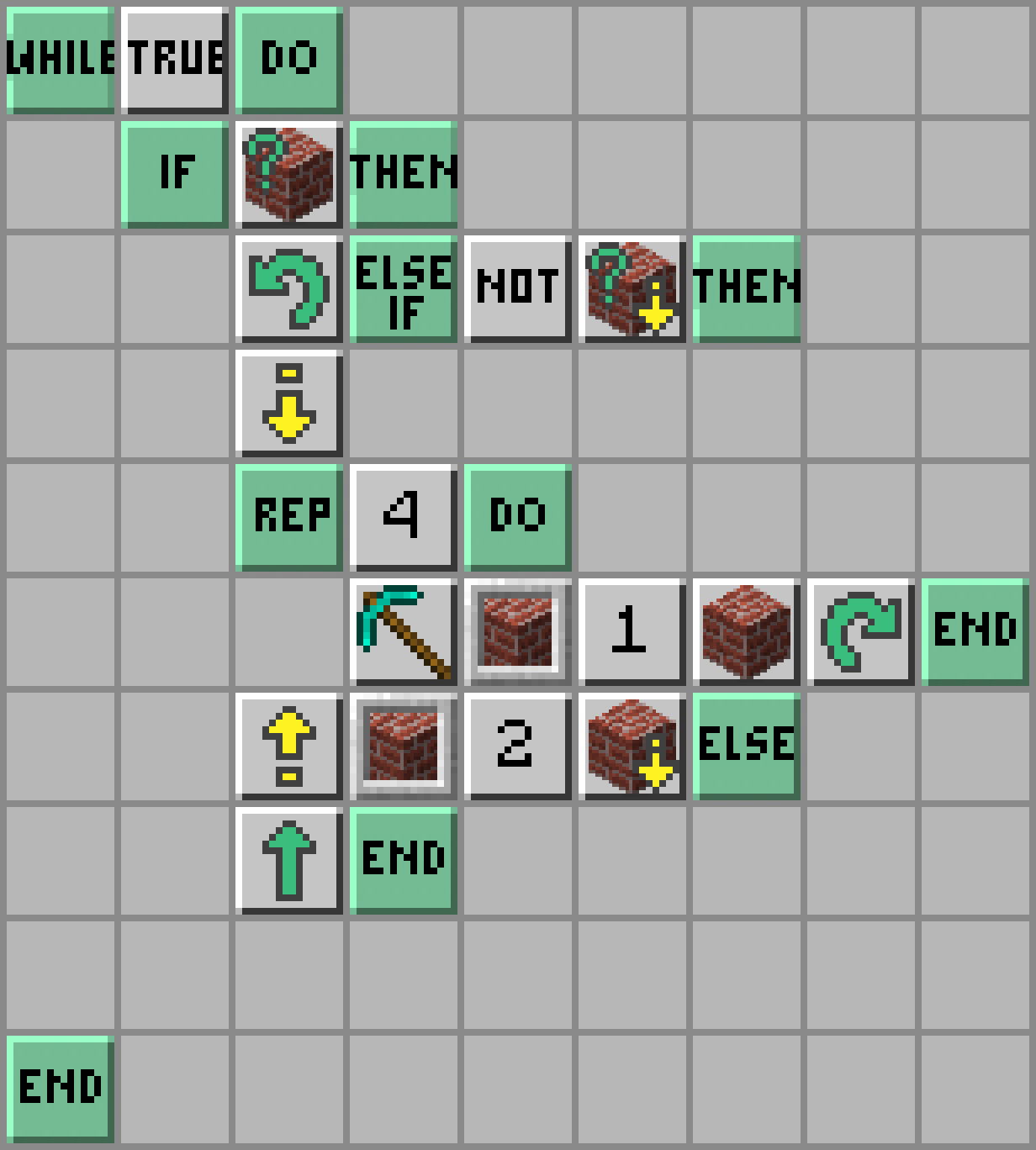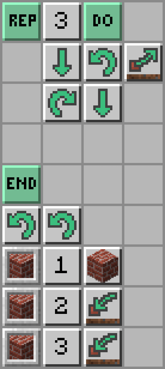 - Żółwik wykopie blok przed sobą: Dig; wybierze bloki ze swojego ekwipunku ze slotu 1: Select Slot - Number (1); postawi blok przed sobą: Place; i obróci się w prawo: Turn Right