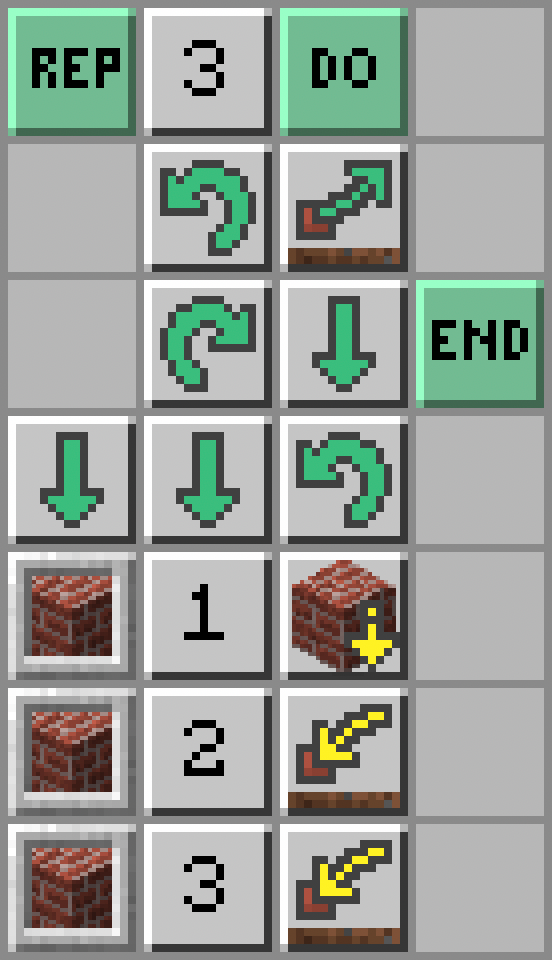 - Żółwik obróci się w prawo: Turn Right; wykopie blok przed sobą: Dig; wybierze bloki ze swojego ekwipunku ze slotu 1: Select Slot - Number (1); postawi blok przed sobą: Place; i znów obróci się w prawo: Turn Right