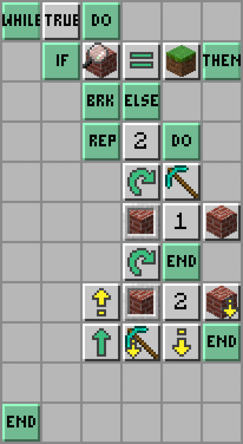 - Następnie ruszy się w górę: Move Up; wybierze bloki ze swojego ekwipunku ze slotu 2: Select Slot - Number (2); postawi blok pod sobą: Place Down; ruszy się do przodu: Move Forward; wykopie blok pod sobą: Dig Down; i ruszy się w dół: Move Down