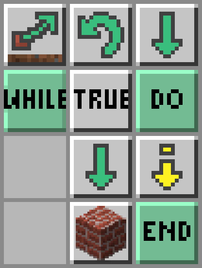 - Żółwik będzie wykonywał następujące polecenia, dopóki będzie to dla niego możliwe: żółwik ruszy się do tyłu i w dół, a następnie postawi blok przed sobą.