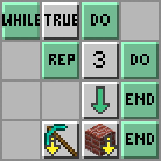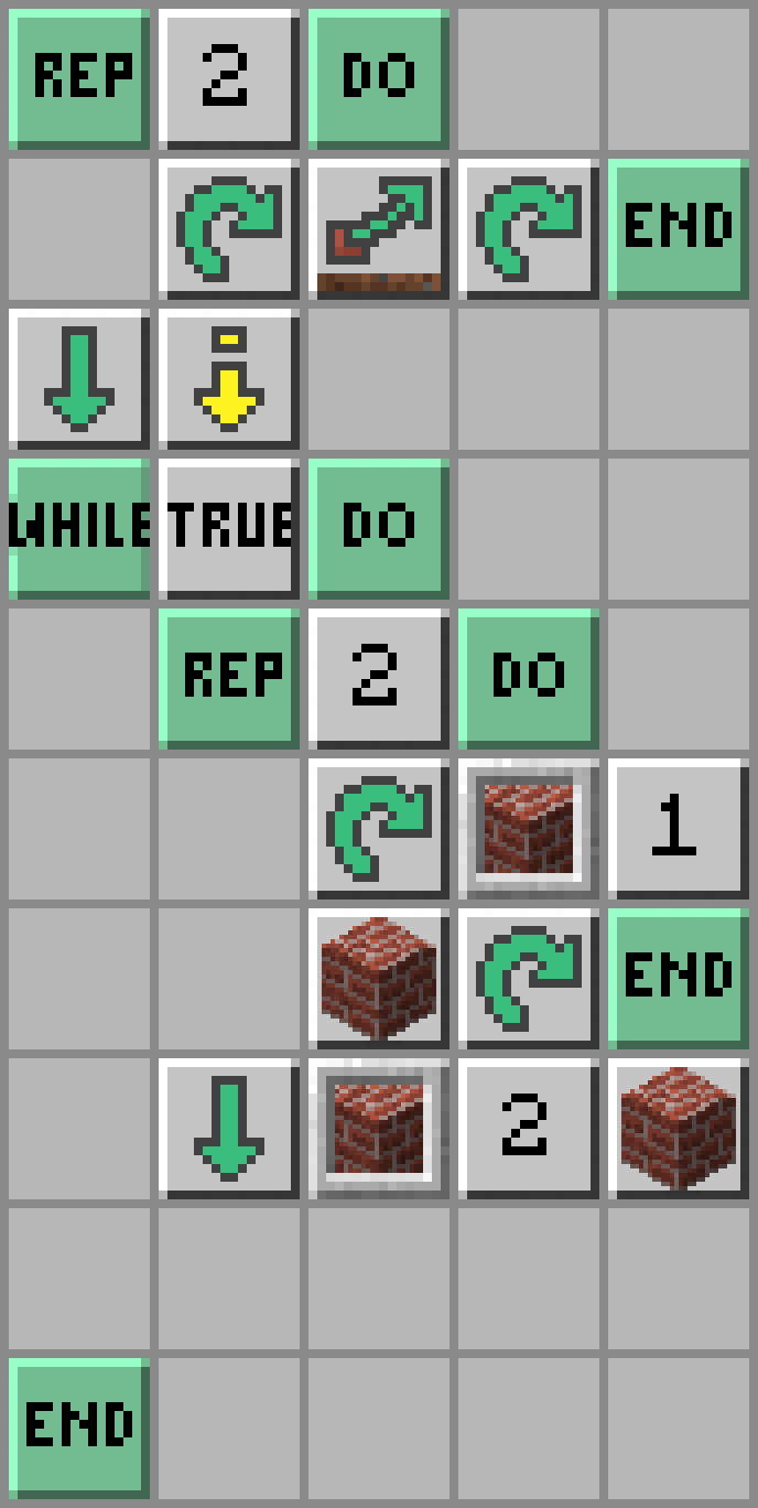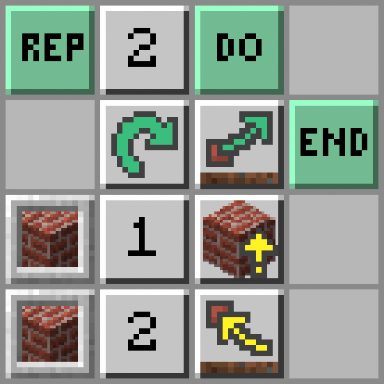 - Żółwik powtórzy następujące polecenia dwa razy: żółwik obróci się w prawo; wybierze bloki ze swojego ekwipunku ze slotu 1; postawi blok przed sobą; i znów obróci się w prawo.